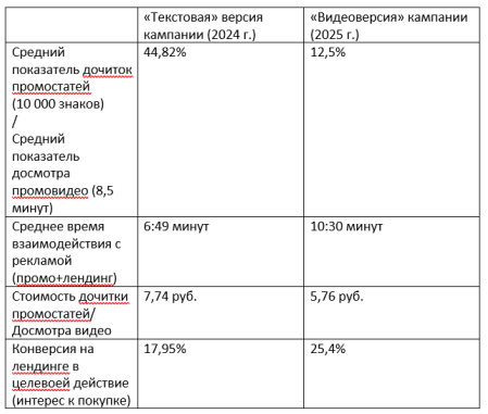 Поэтому мы можем сделать значимое сравнение с показателями предыдущего запуска этой кампании, где вместо длинного видео использовали длинные промостатьи.