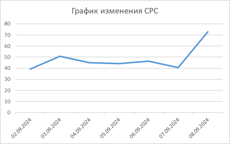 - Стоимость клика (CPC) варьировалась от 44 до 71 рублей.