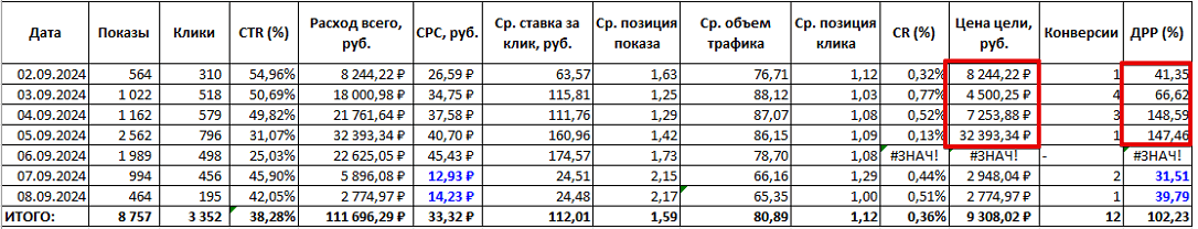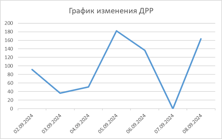 Ситуация в этой рекламной кампании развивалась похожим образом. Мы повышали ставки с 63,57 до 160,96 рублей, выкупая все больше брендового трафика — его доля выросла с 76,71% до 86,15-88,12%. В период со 2 по 6 сентября стоимость клика увеличилась с 26,59 до 45,43 рублей, а ДРР вырос больше чем в 3 раза — до 147,46 %. CTR упал еще больше, чем в московской РК — с 55 до 25 %.