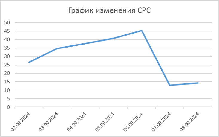 Картина стала совсем мрачной, и ситуация требовала срочных мер. Чтобы окончательно не погубить кампанию, пришлось максимально оперативно переходить на стратегию «целевая доля рекламных расходов (ЦДРР)» и вручную задавать долю рекламных расходов. Результат — снижение стоимости заявки до приемлемых 2 774 рублей при ДРР в 39,79. А еще — снижение стоимости клика в 3 раза, если сравнивать с 6 сентября. Все прекрасно, но…