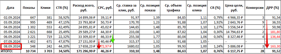 И самое странное. Если увеличение ДРР и CPC при поднятии ставки — вещь абсолютно закономерная, то уменьшение CTR (кликабельности объявлений) — как минимум нелогичная. Ведь чем чаще объявление показывается на первых строчках выдачи, тем чаще на него нажимают, а здесь вышло ровно наоборот: CTR обвалился с 59 % до 44 %.