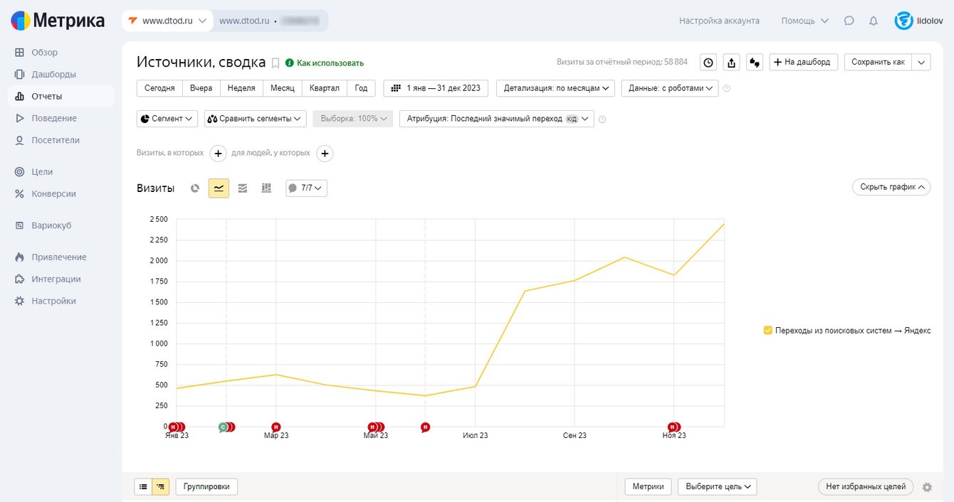 С августа 2023 года трафик вырос заметно сильнее. Это совпало с этапом, когда на сайте кратно увеличилось количество страниц услуг и направлений.
