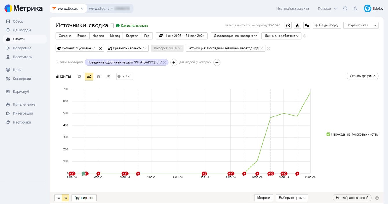 Здесь важно учитывать ограничение: Метрика фиксирует именно клик по кнопке WhatsApp, а не факт реального диалога. По данным клиента, конверсия клика в диалог составляла около 4,4%.