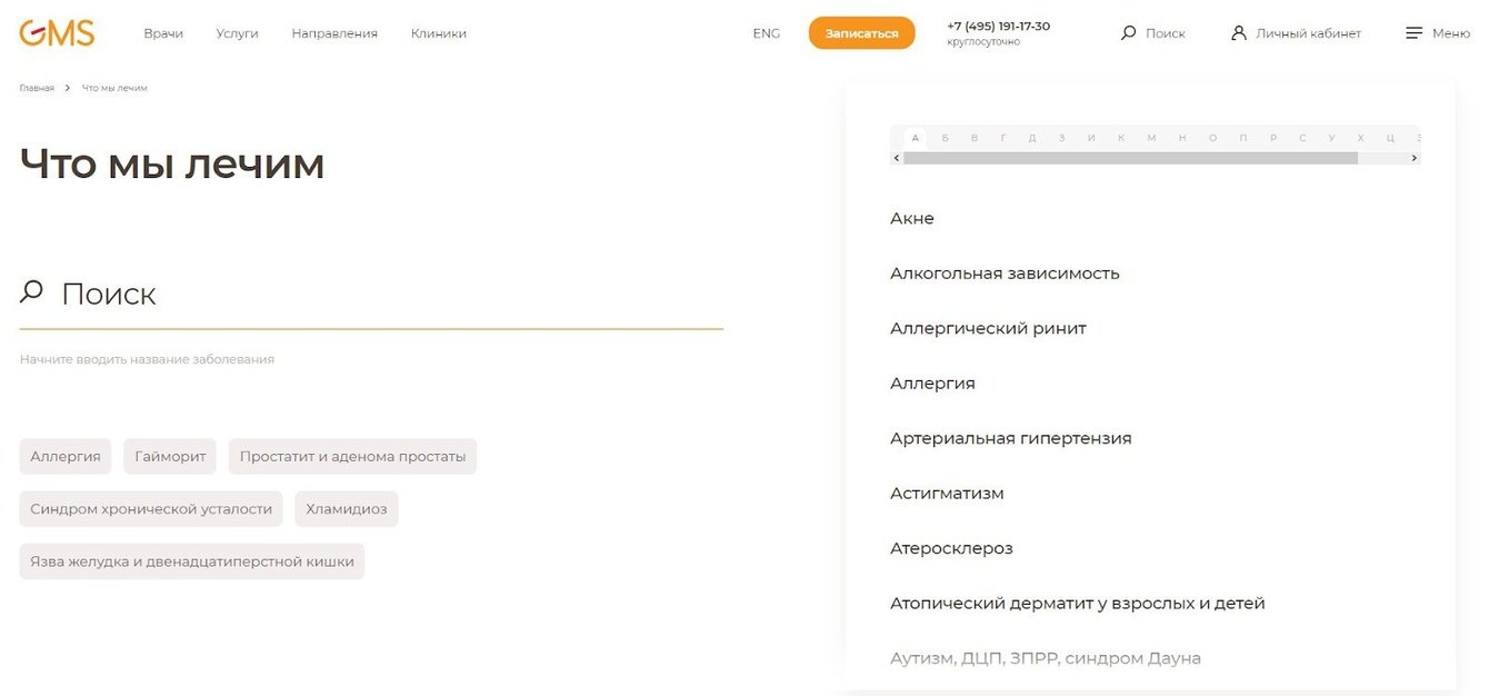 Наш давний клиент — GMS Clinic, сделали редизайн своего сайта с другим агентством. Перенос на домен и запуск откладывали несколько раз и в конце концов провели, не дождавшись выполнения всех необходимых работ. Качественную проработку и полноценное тестирование провести не успели. В итоге на сайте после запуска было много багов верстки, устаревших неработающих ссылок в контенте, несоответствие структуры URL и других технических ошибок. У сотрудников клиники не было времени и ресурсов самим разбираться с этим. Чтобы оперативно устранить технические ошибки и поправить контент на сайте, клиника обратилась к нам.