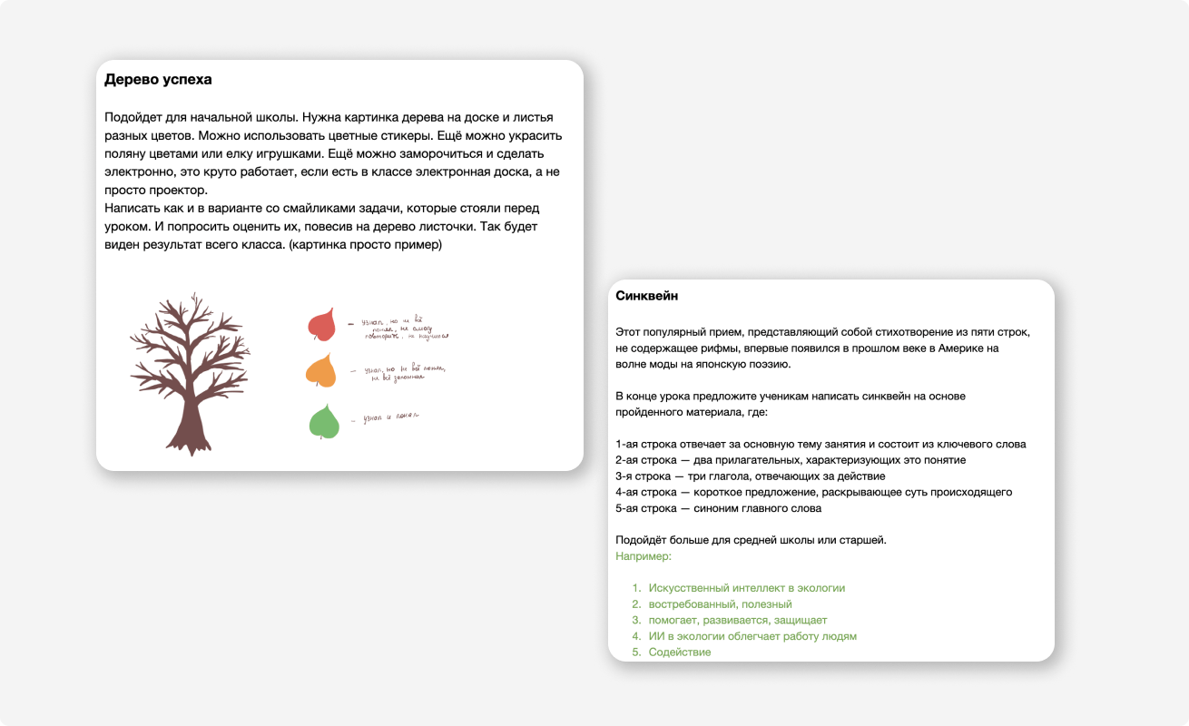 В конце каждого урока нужно дать возможность ученикам отметить, что им запомнилось, понравилось, а что нет. Мы изучили форматы рефлексии и добавили разные варианты, например, таблицу де Боно, «Дерево успеха», «Синквейн».