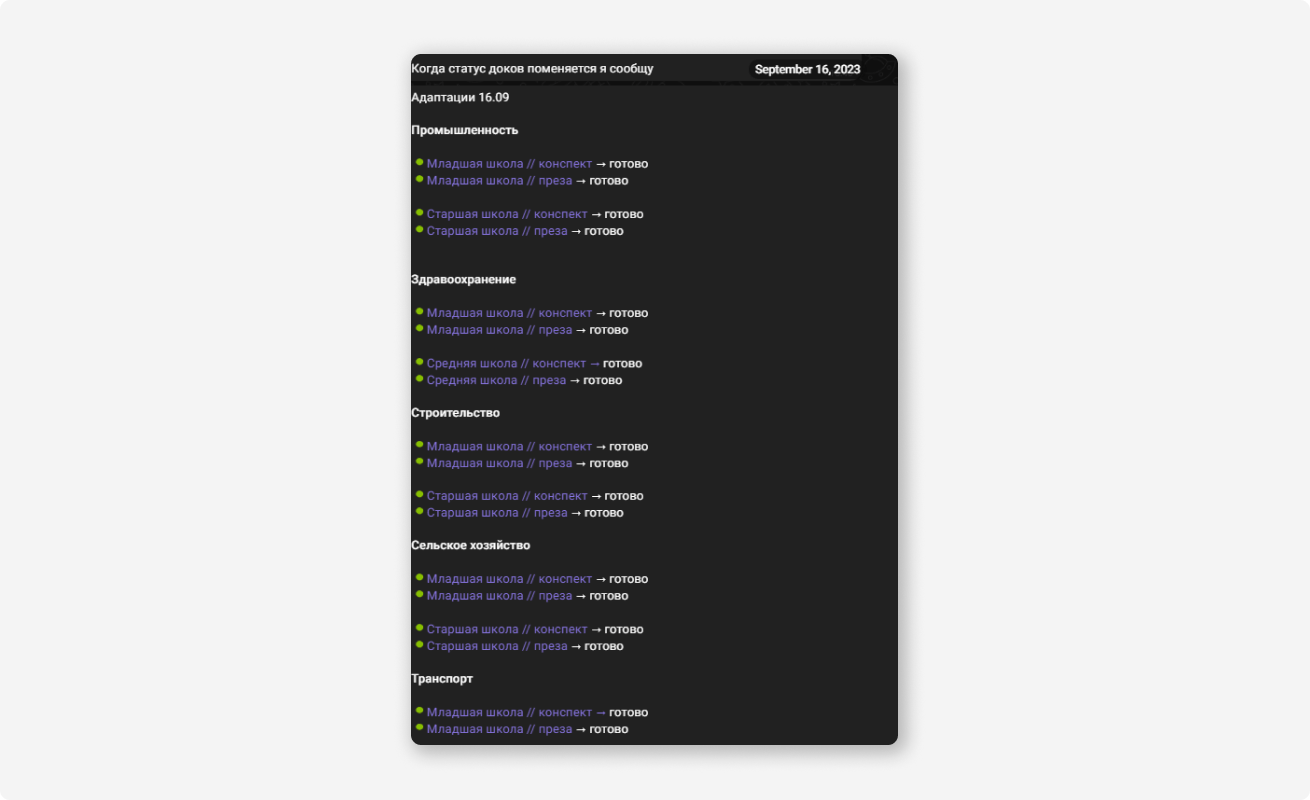 Мы начали работать 25 августа и уложились в первый, самый важный дедлайн. Написали 20 текстов к 18 сентября — уложились за 16 рабочих дней. Практически на самом старте учебного года их уже опубликовали на сайте. Любой преподаватель мог скачать методичку, презентацию и провести урок.