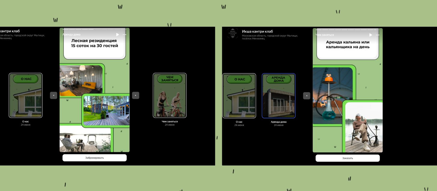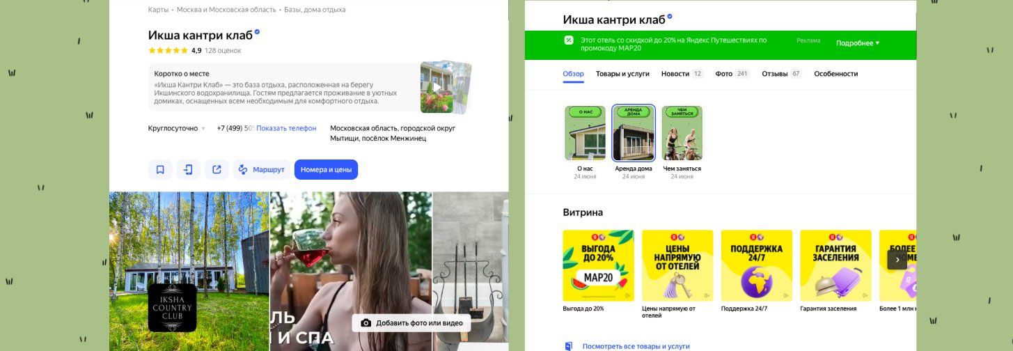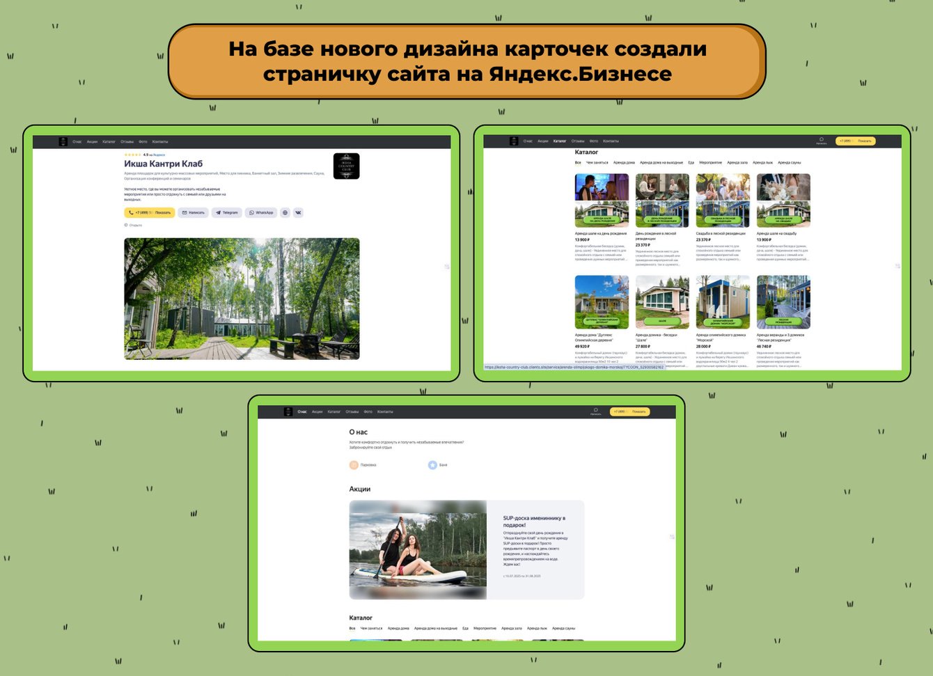Создали новый дизайн карточек товаров, услуг и историй на платформе Яндекс.Карты — в стиле, перекликающемся с фирменным стилем презентации клиента. Именно презентация базы отдыха была выбрана в качестве основы, так как отражала актуальное позиционирование, была визуально цельной и понятной для целевой аудитории. Такой подход позволил сохранить единый образ бренда, несмотря на проблемы с основным сайтом.