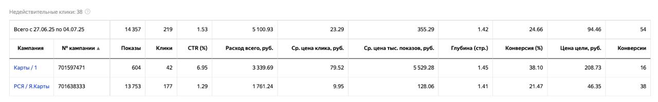 Тестовая рекламная кампания «Карты / 1» показала лучшую динамику, даже с учетом небольшого охвата и количества переходов. Мы получили 3 ключевых конверсии: 2 звонка и 1 бронирование.