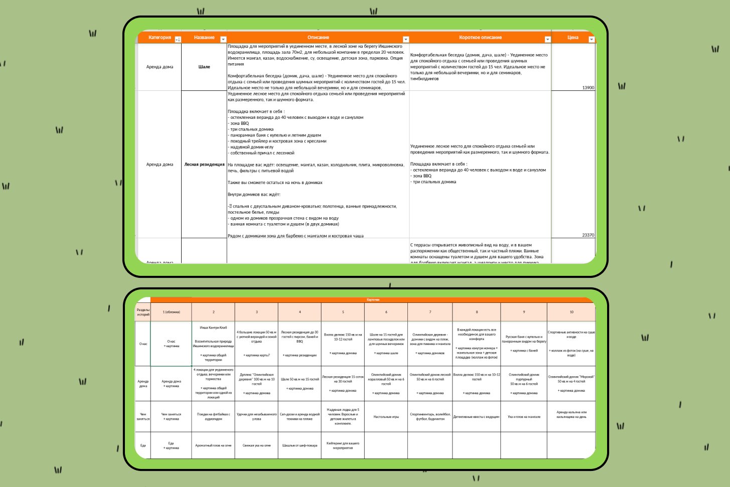 Одной из главных сложностей было актуализировать текущие прайсы и собрать информацию по каждому востребованному дому и развлечению в единый табличный файл, чтобы потом добавлять из него информацию в карточки разделов на Яндекс.Картах.