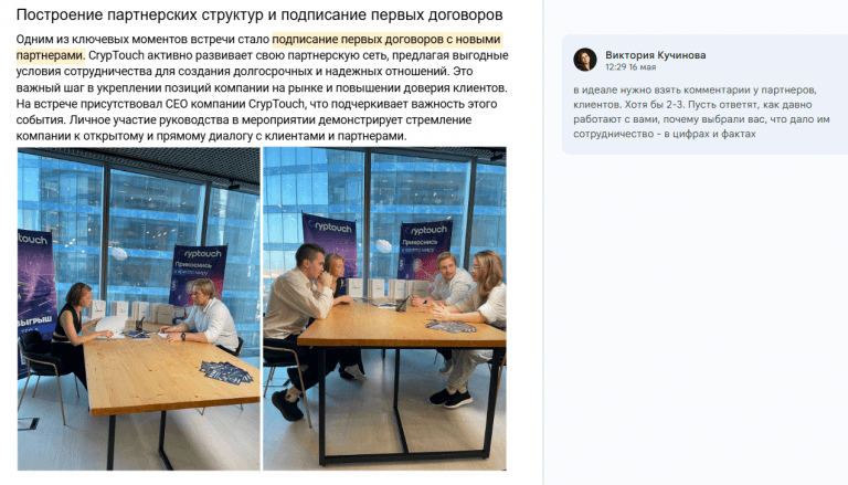 Криптовалюта — не наша тематика, мы ни разу с ней не работали. Но вот публикации в СМИ, на VC и других площадках мы делаем. Региональный директор компании CrypTouch Наталия Заря нашла нас в поиске, набрав запрос “опубликовать статью в сми”.