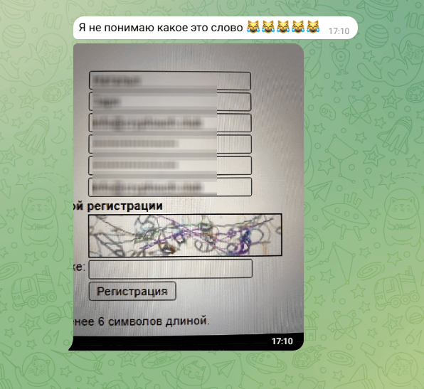 Были и забавные моменты (правда, в момент регистрации после получасовых тыканий в нечитаемую пикчу хотелось плакать). На одной площадке — не будем называть имен, чтобы зарегистрироваться, нужно заполнить пикчу.