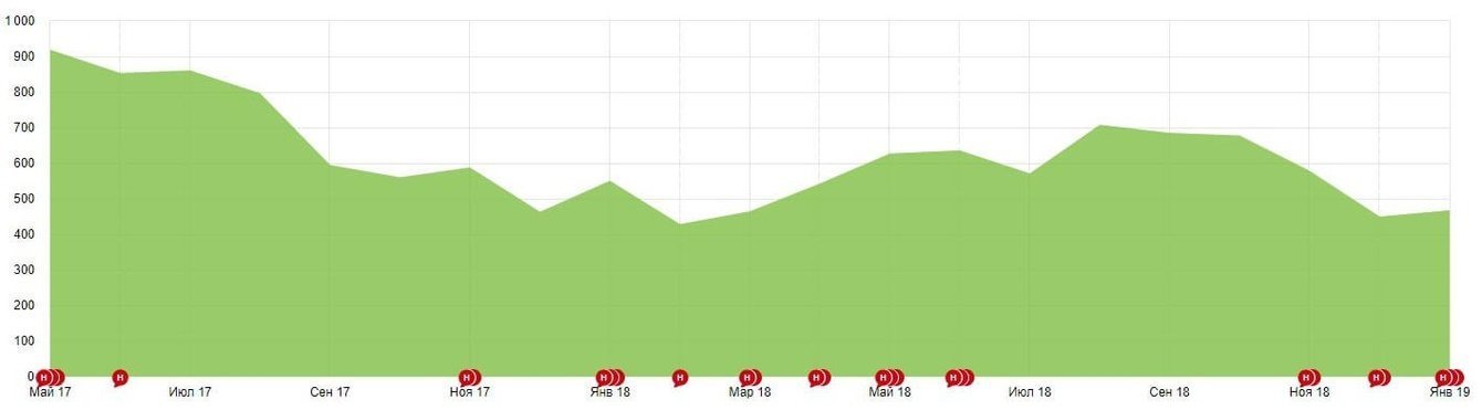 Посещаемость сайта из поиска характеризовалась отрицательной динамикой в течение минимум 2 лет. На момент проведения аудита — до 1000 чел/мес.