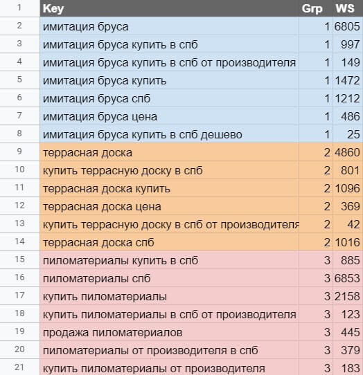 Кластеризация тегов — заголовков и описаний страниц — напрямую работает на улучшение ранжирования. Группировку запросов, которые соответствуют содержанию посадочных страниц сайта, мы провели по стандартному принципу.