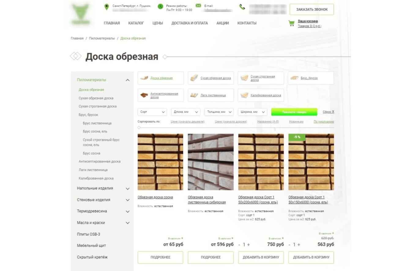 В каталоге заказчика на посадочных страницах насчитывалось не более 10 карточек товара. На основе прайс-листа, взятого с сайта, мы увеличили их количество — например, на странице «Имитация бруса» с 2 карточек до более чем 80.