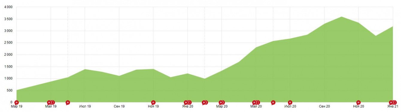 Посещаемость сайта из поиска характеризовалась отрицательной динамикой в течение минимум 2 лет. На момент проведения аудита — до 1000 чел/мес.