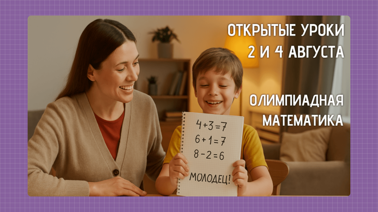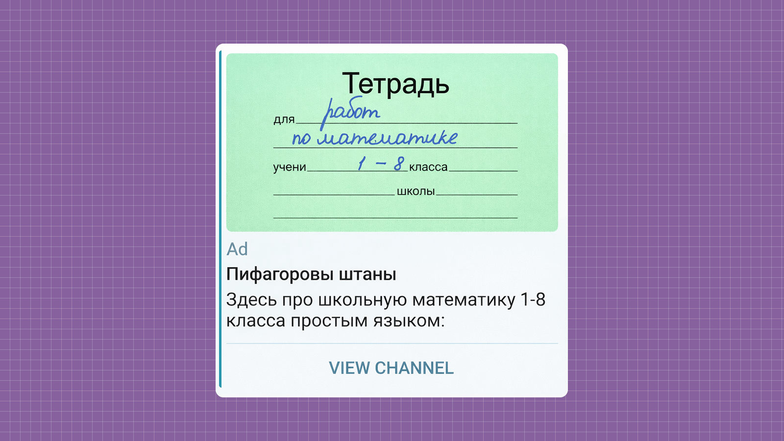Самые сильные креативы — простые и узнаваемые. Короткий текст. На картинке — то, что родители видят каждый день: обложка тетради по математике, скриншот задачи из учебника, обычная школьная обложка.