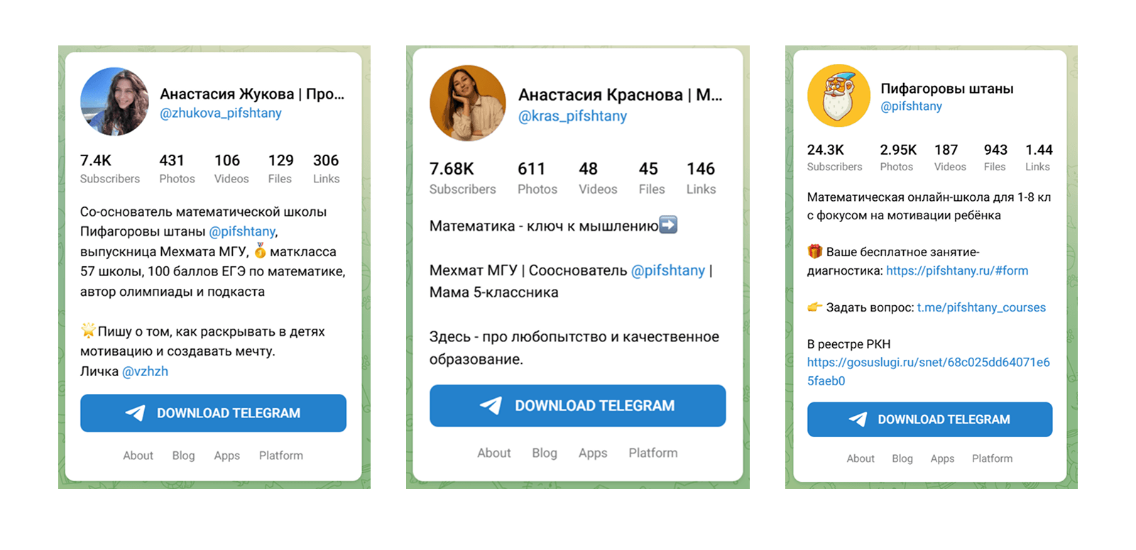 У школы три Телеграм-канала. Основной — @pifshtany (позиционирование от лица всей школы). Канал сооснователя школы Анастасии Красновой (@kras_pifshtany) — с материнским акцентом: «я сама мама и учу своего сына». Канал соосновательницы школы Анастасии Жуковой (@zhukova_pifshtany) — с экспертным подходом действующего преподавателя.