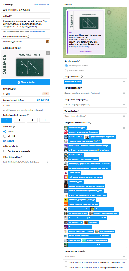 Сначала собирали большие группы каналов по сегментам и запускали одинаковые креативы на всю группу. Смотрели, какие работают. Потом лучшие объявления ставили «один к одному» — отдельно на каждый канал. Так быстро понимали, где сидят активные родители 35–45 лет.