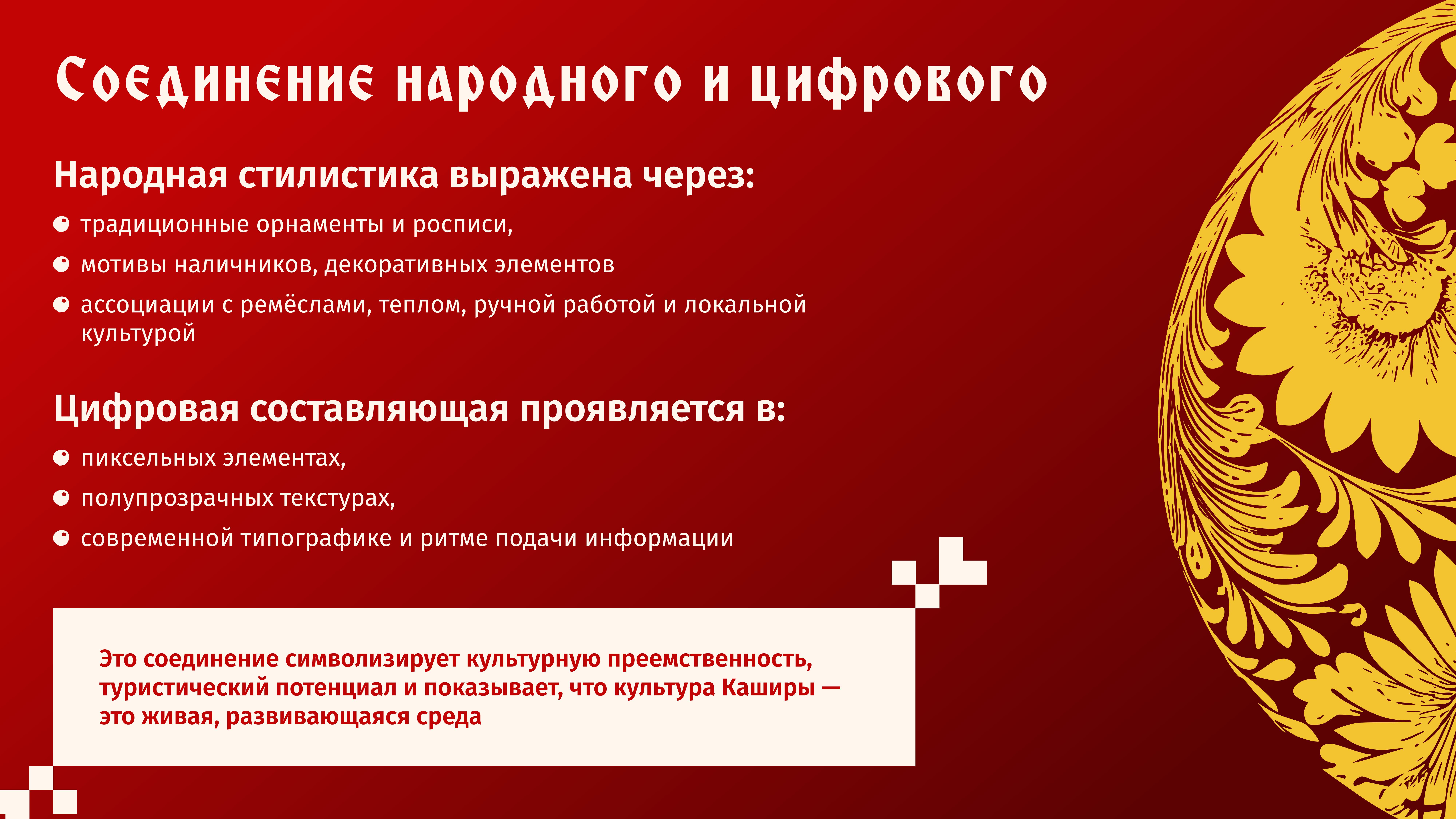 В видеоэкскурсиях ожили улицы: зазвучали колокольные звоны, зашумели ярмарки, заблестели золотые купола на солнце. И везде — тот же узор, те же цвета: алый, как ягода калины, чёрный, как дубовые стволы, молочный, как утренний туман, золотой, как спелая рожь.