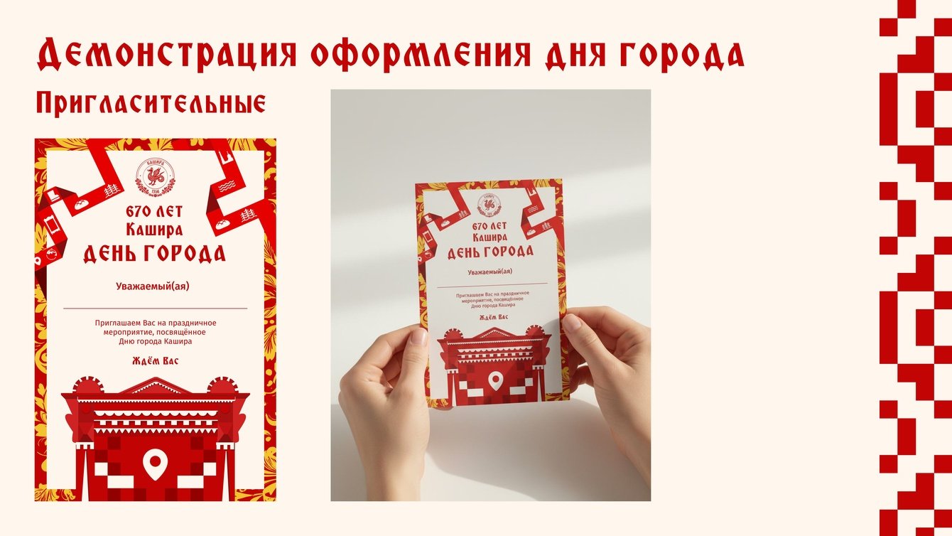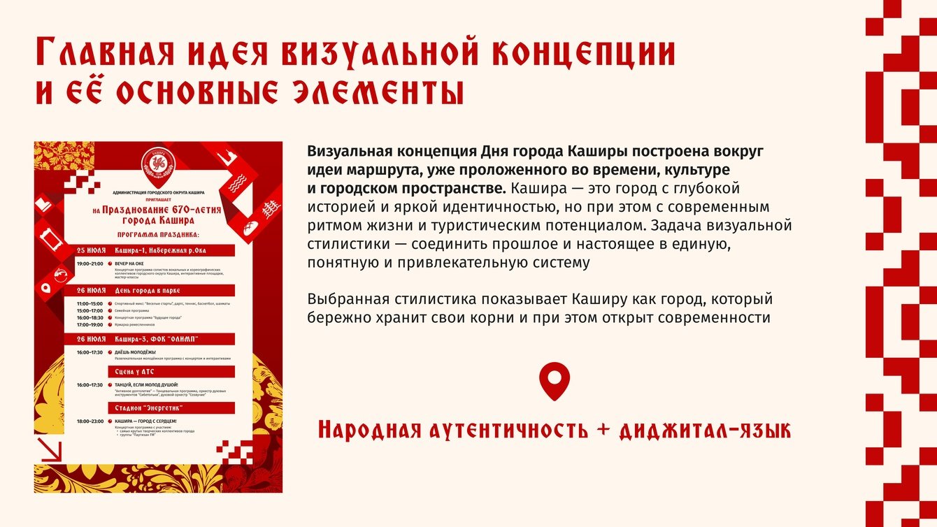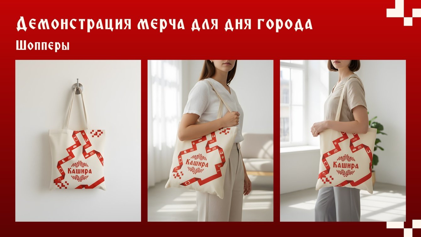 «Кашира: где история встречает тебя». Город с 700‑летней историей (с 1356 года), где каждый найдёт что‑то своё: путешественник — памятники, музеи, экскурсии; семья — уютные кафе, парки, детские активности; предприниматель — возможности для бизнеса и инвестиций; местный житель — гордость за родной город и участие в его развитии.