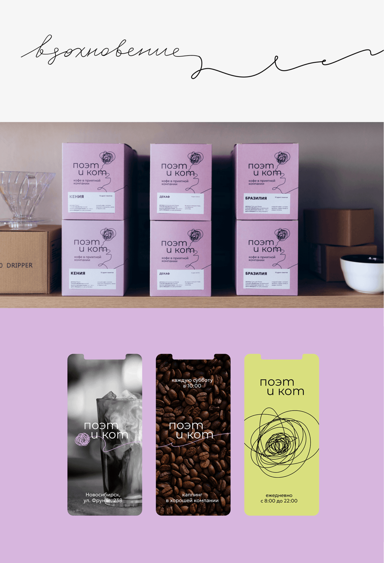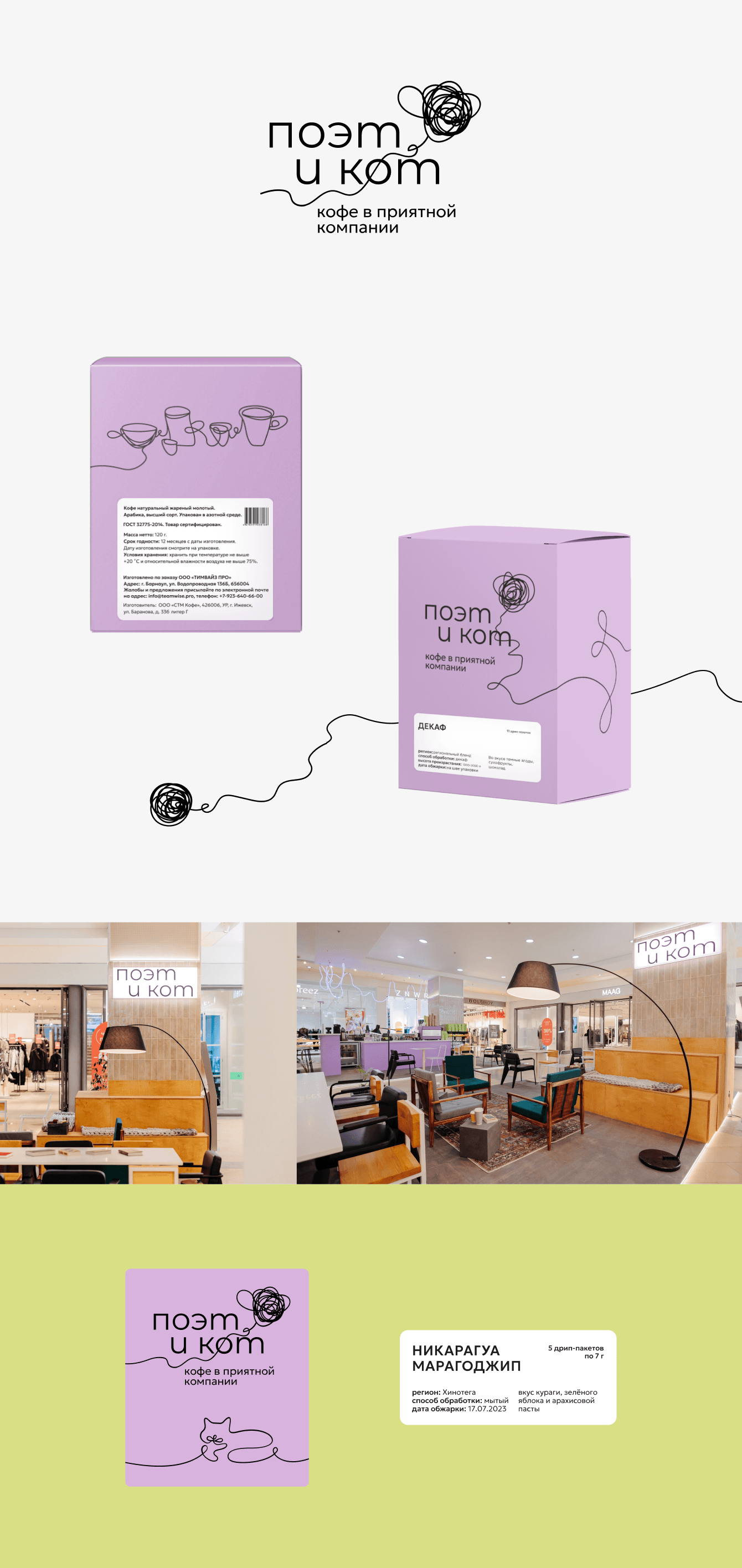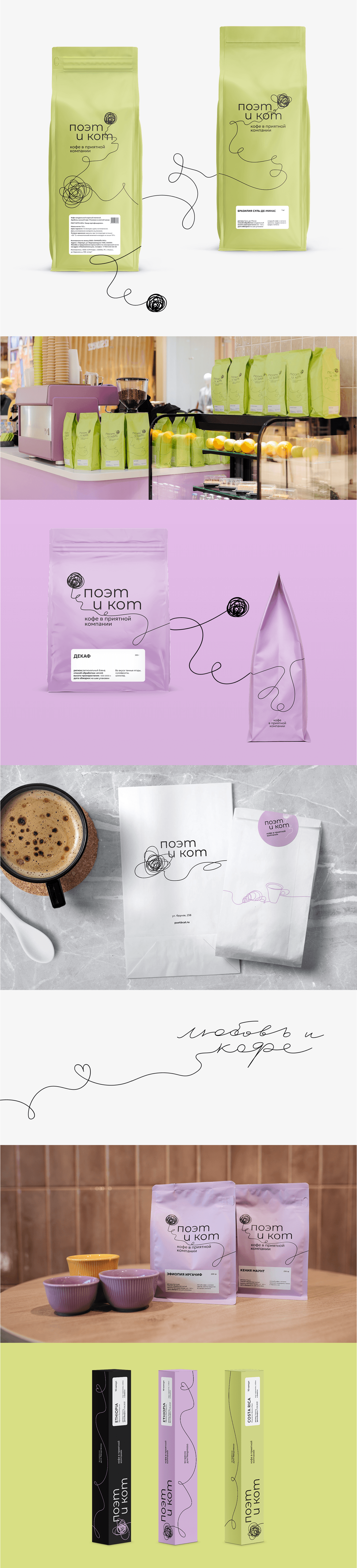 Проект «Поэт и Кот» стал для команды новым этапом — выходом на рынок как самостоятельного бренда. Нужно было создать айдентику, которая объединит сразу несколько направлений: зерно, дрипы, капсулы, кофейни и атмосферу общения, ради которой сюда приходят.— Разработали позиционирование и визуальный образ бренда.