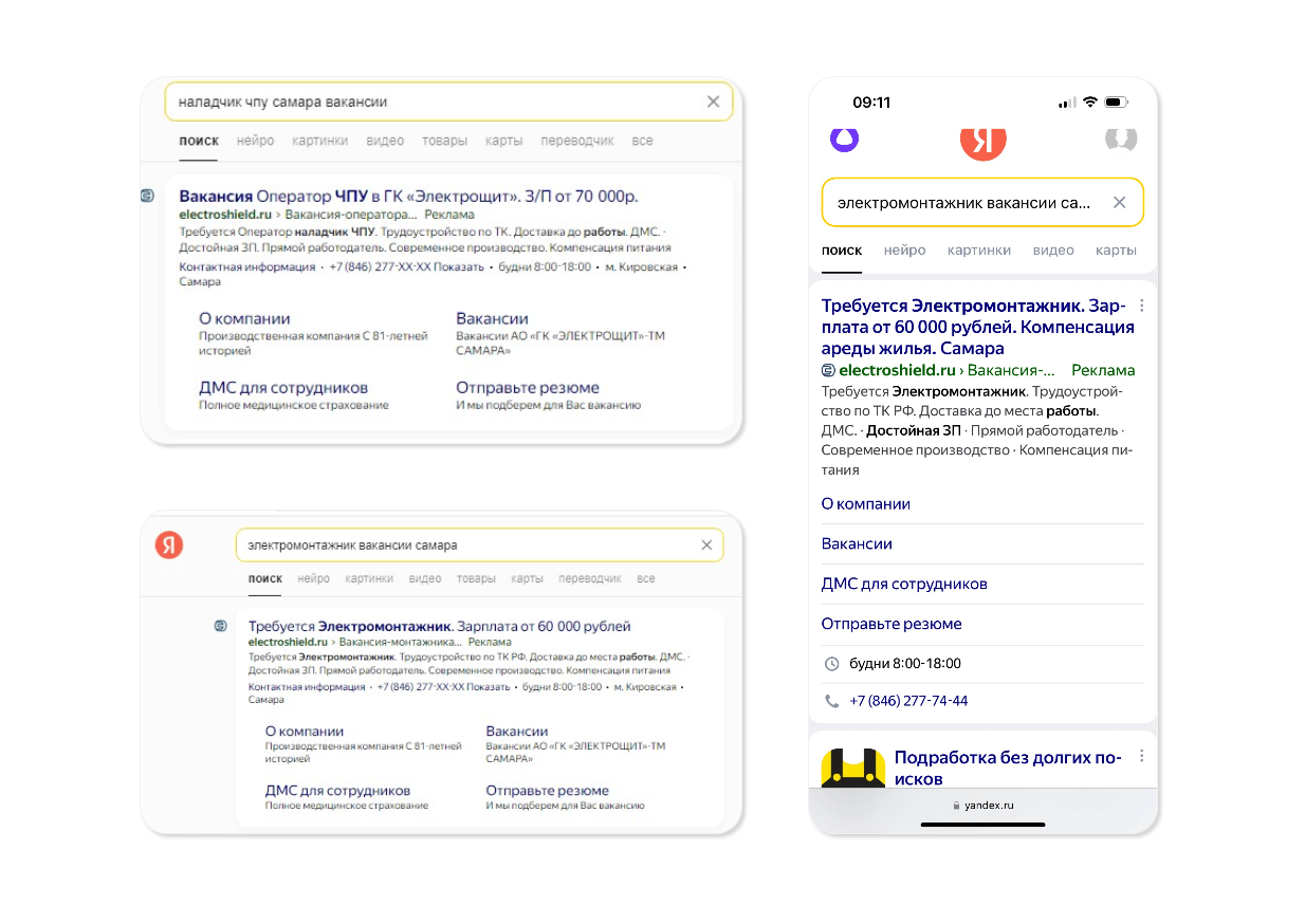 Опыт показал, что лучше всего работают такие инструменты, как контекстная реклама в Яндекс Директе и таргетированная реклама в VK ADS. Они позволяют дать лучший результат в короткие сроки при сохранении эффективности на длинной дистанции, когда потребность в сотрудниках не эпизодическая, а постоянная.