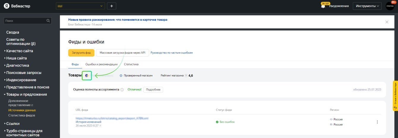 Следить за статусом фида можно в Вебмастере: