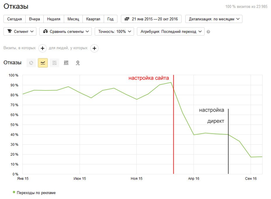 Последующая настройка директ позволила снизить параметр отказов до 20%.