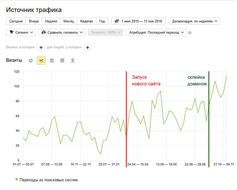 Как это часто бывает - одним из факторов, снижающим индексирование, позиций и посещаемость, являлось наличие сайтов аффилиатов. При наличии нескольких сайтов, которые частично или полностью дублируют тематику и контент, а так-же имеют ряд других общих показателей, на такие веб-ресурсы может быть наложен фильтр аффилирования. В данном случае такой фильтр применен к нескольким проектам компании, которые имеют идентичные разделы и страницы, а так-же ссылаться и упоминают смежные сайты. В октябре 2016 г. удалось произвести склейку доменов основного аффилата. В течении последующего месяца график демонстрирует рост посещаемости, основной эффект будет выявлен в ближайшие несколько месяцев.