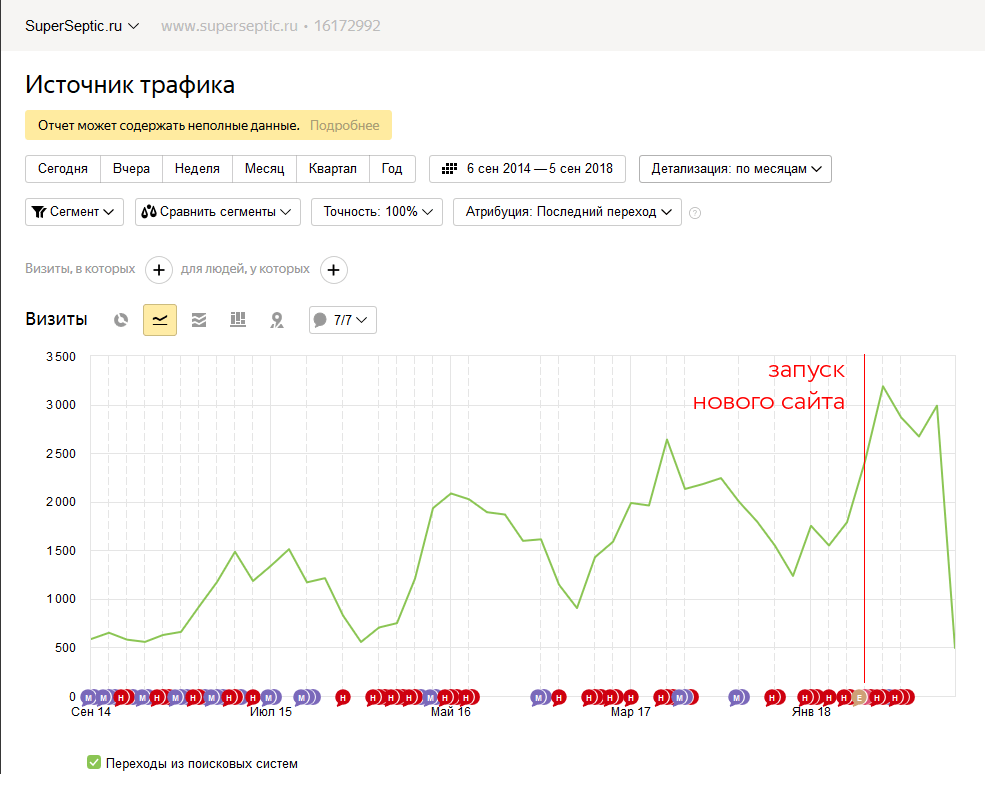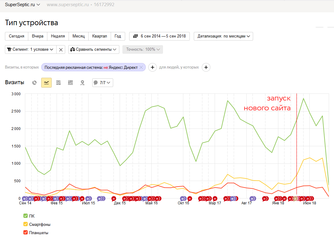 Была изменена структура каталога, функционал, внедрен адаптивный дизайн, заменен движок MODX на Битрикс. Контент и наполнение было перенесено со старого сайта без изменений. Сайт имеет сильно выраженную сезонность, поэтому далее все сравнения будем приводить в отношении идентичного периода прошлого года.