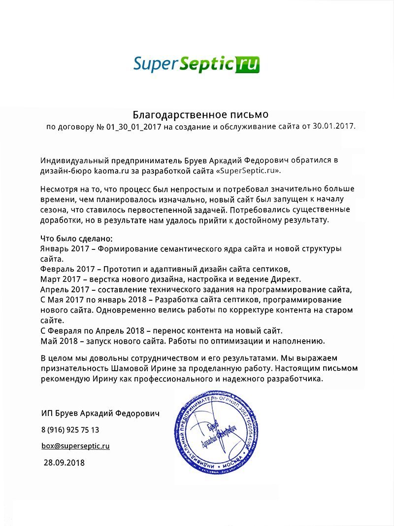 Индивидуальный предприниматель Бруев Аркадий Федорович обратился в дизайн-бюро kaoma.ru за разработкой сайта «SuperSeptic.ru».