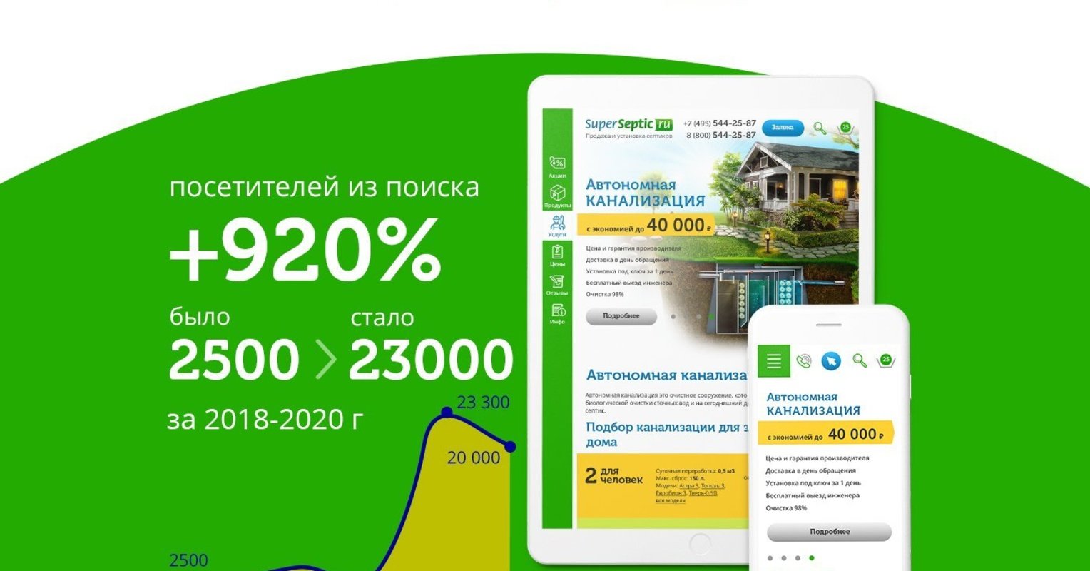 Кроме того, старая структура исключала один из самых точных, тематических и конверсионных запросов – «Автономная канализация для частного дома», который в новом решении был направлен на главную страницу. Помимо этого, мы добавили информационный функционал в соответствии с наиболее эффективной и современной стратегией продвижения не коммерческих, а информационных сайтов. Это: услуги, цены, отзывы, вопросы, документы, термины, производители и обзоры.
