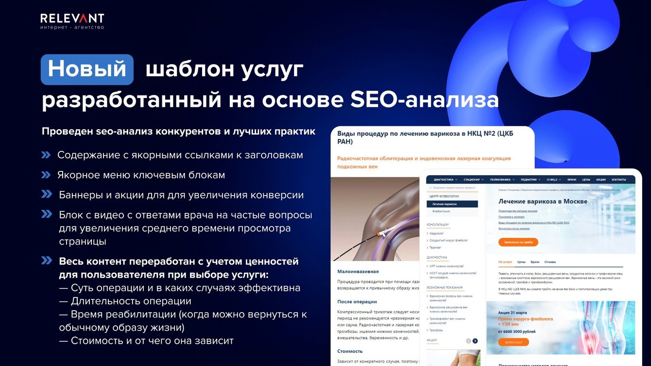 ✔ Создание нового шаблона для страниц услуг, который объединяет преимущества информационных статей и лендингов.