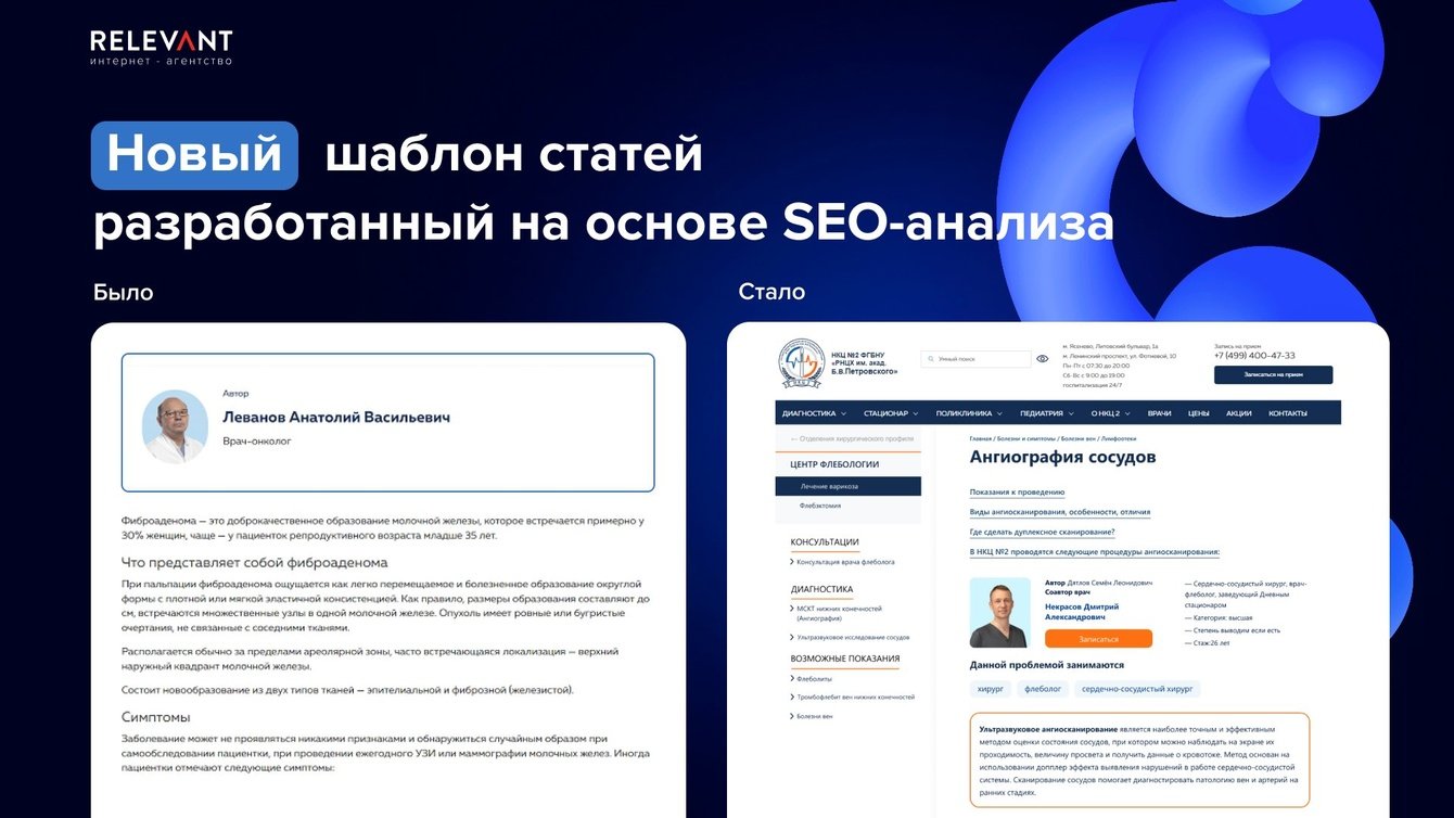 На момент начала работ: информационные статьи, посвященные болезням и симптомам, размещались на сайте без четкой структуры и последовательности. Текстовый контент не отражал статус и уровень крупной многопрофильной клиники федерального масштаба. Материалы уступали конкурентам по уровню информативности, не было единого стандарта оформления страниц.