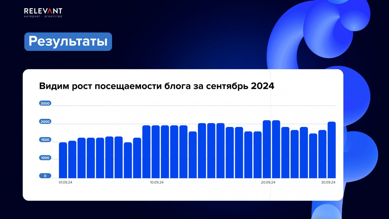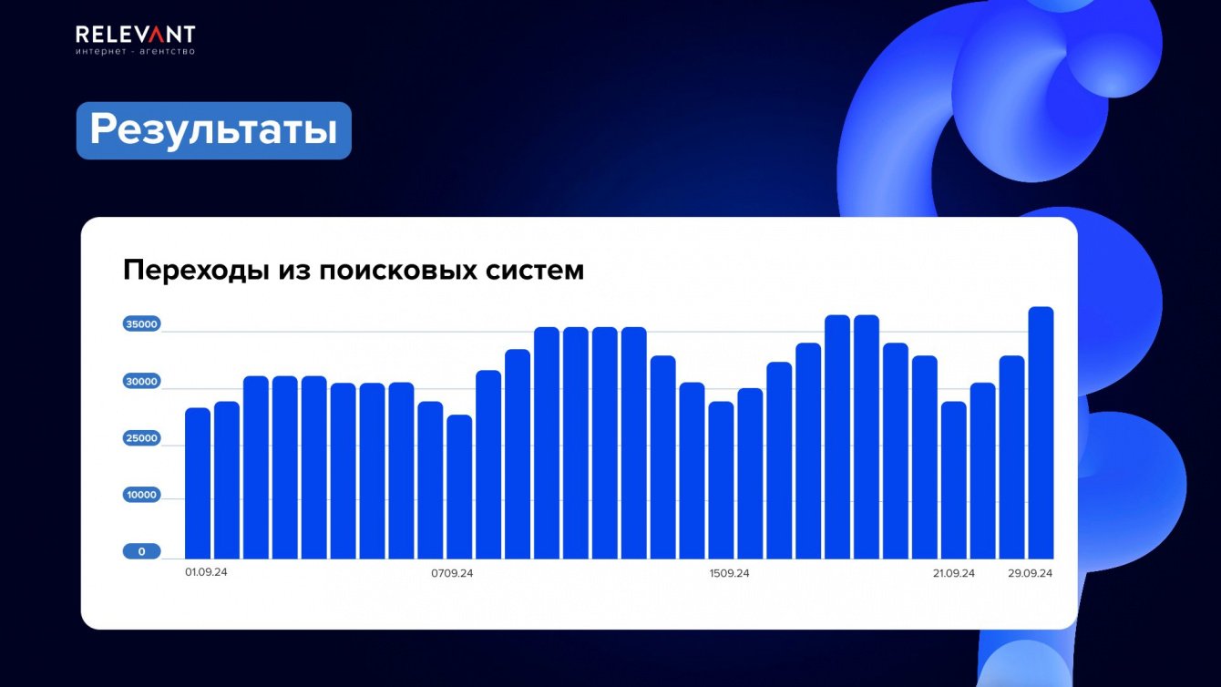 На примере графика за сентябрь 2024 мы видим рост посещаемости сайта. Учитываются переходы из поисковых систем. При этом посещаемость в течение всего месяца держится на стабильно высоком уровне, без резких взлетов и падений. Этот результат обусловлен не только контент-маркетингом, но он подтверждает эффективность нашей стратегии.