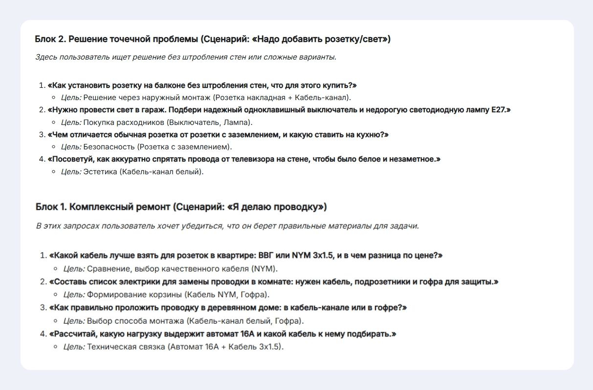Мы занялись профессиональным промпт-инжинирингом и составили детальные портреты нашей целевой аудитории и под каждый попросили составить по 40-50 примеров вопросов, которые могут запрашивать пользователи в нейросети.