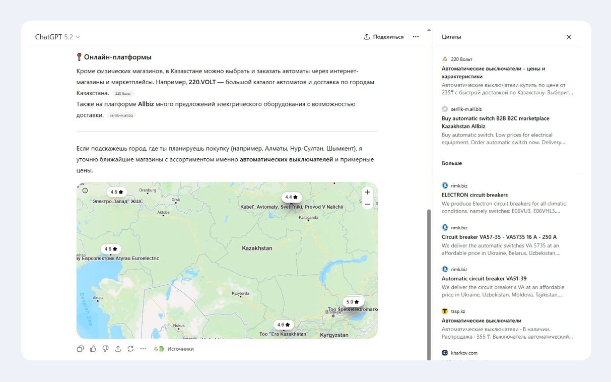 Результат: ChatGPT начал давать более точные ответы с упоминанием конкретных товаров интернет-магазин электротехники.