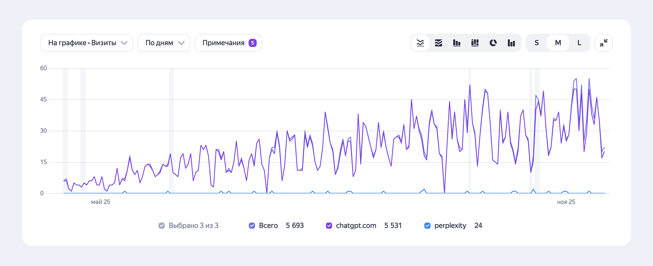 💡 Инсайт: Пользователи из ChatGPT смотрят меньше страниц, но проводят на сайте в 3,2 раза больше времени. Почему? Они уже знают, что ищут. ChatGPT дал им рекомендацию, они пришли проверить цену и условия. Никаких долгих блужданий по сайту — конкретная задача, конкретное решение.