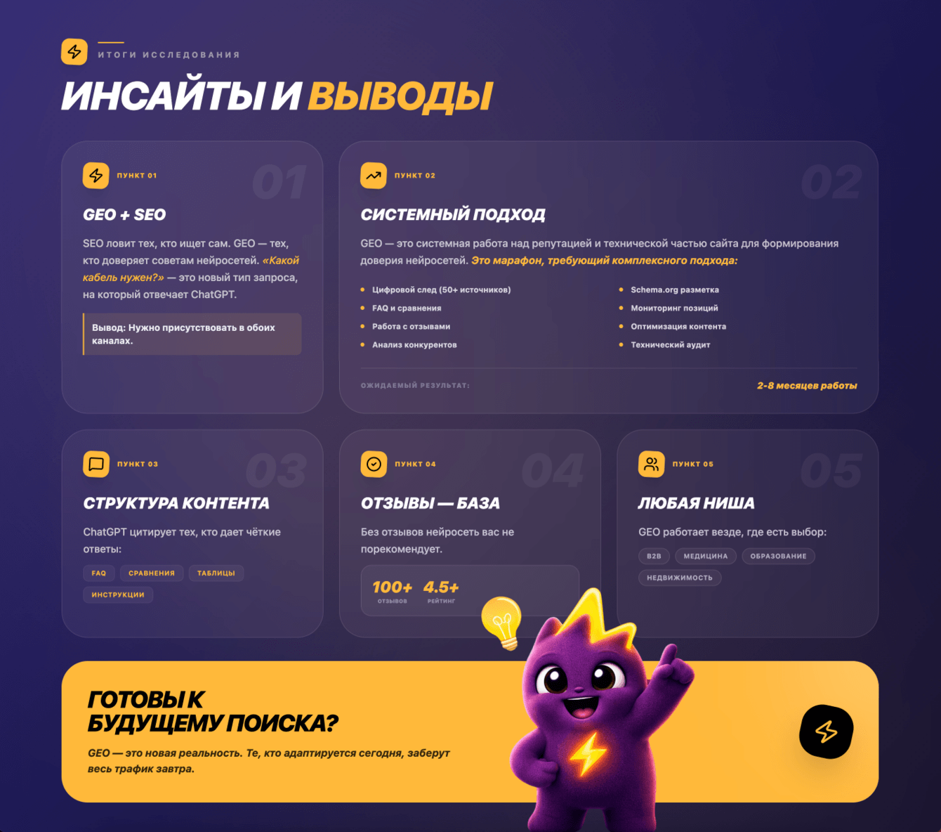 GEO — это не будущее. Это уже настоящее. Мы не ждали, пока кто-то напишет официальный гайд. Мы сами создали методологию, протестировали её на интернет-магазине электротехники и доказали: нейросети можно и нужно оптимизировать.