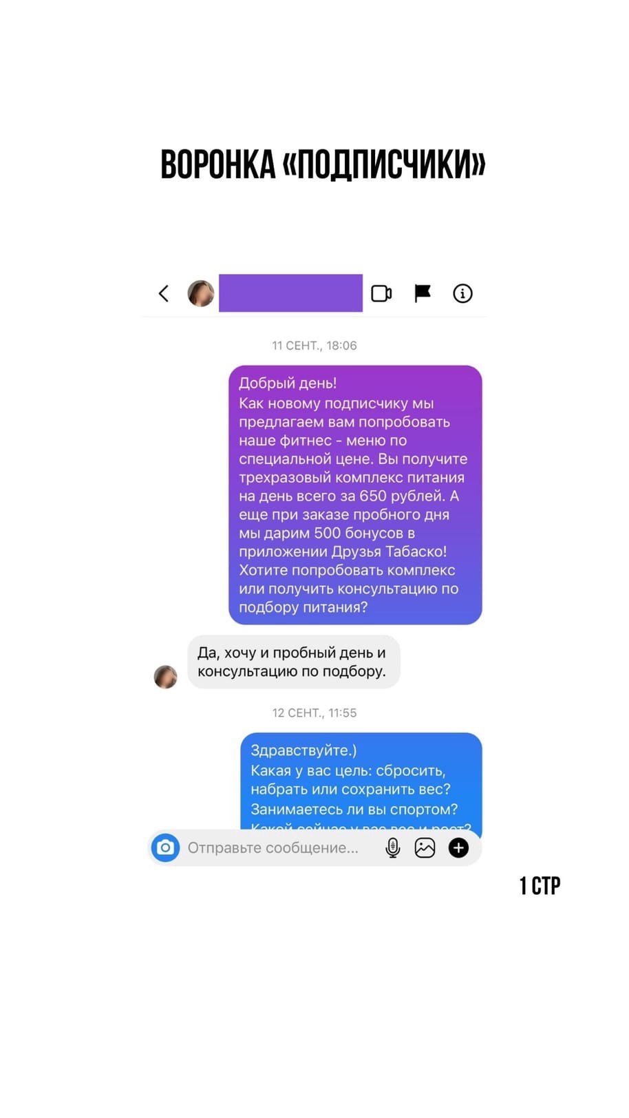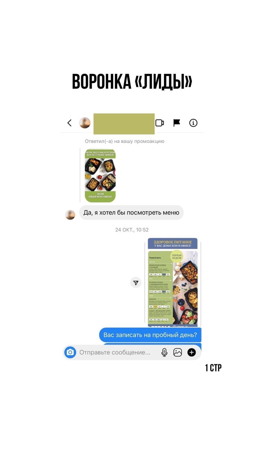 Первая воронка запускалась после того, как пользователь подписывался на аккаунт. Ему направлялось приветственное сообщение с предложением совершить первый заказ по специальной цене и получить бонусы, которые можно потратить на оплату заказа в сети ресторанов- партнеров. Далее заказчик - представитель службы доставки - отрабатывал лид самостоятельно: консультировал и оформлял заказы.