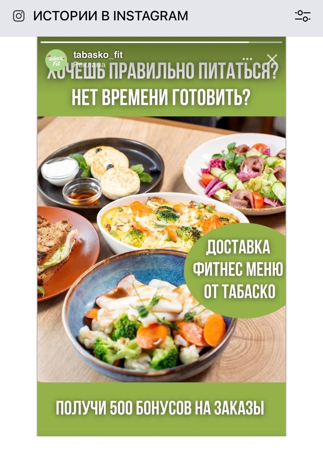 креативы - изображение человека с едой, еды, а также объявления в видеоформате;