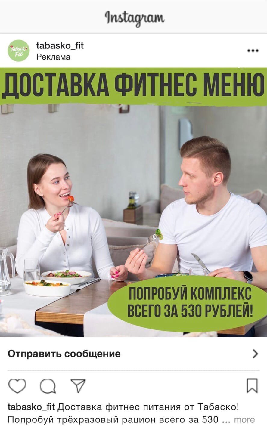 посылы: “Попробуй трехразовый комплекс за 530 рублей”, “Получи бесплатную консультацию по подбору питания”.