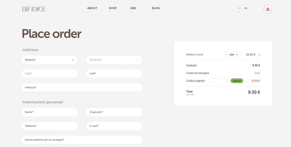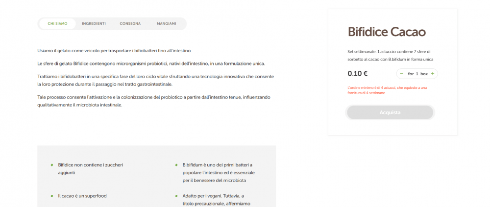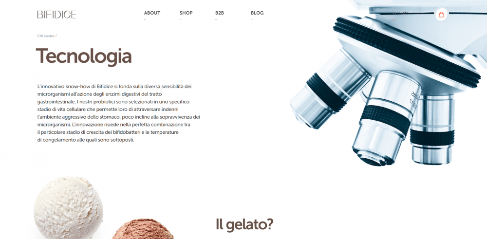 Основная языковая версия сайта разработана на итальянском языке, так как Италия — главная локация продаж Bifidice. Для клиентов из других стран добавлена англоязычная версия сайта.