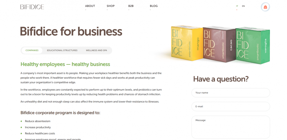 C компаниями Bifidice сотрудничает на особых условиях, поэтому для этого типа заказчиков мы сделали отдельный раздел «B2B», где менеджер может оставить заявку в специальной форме.