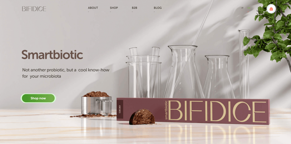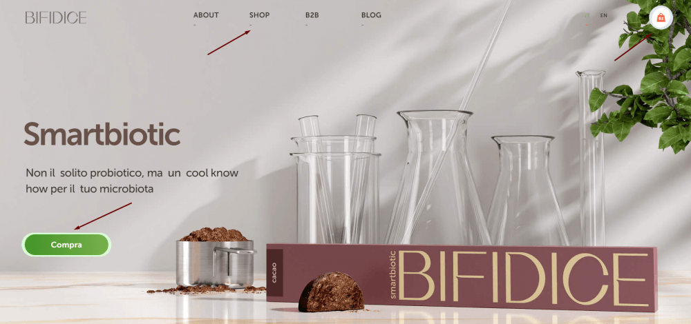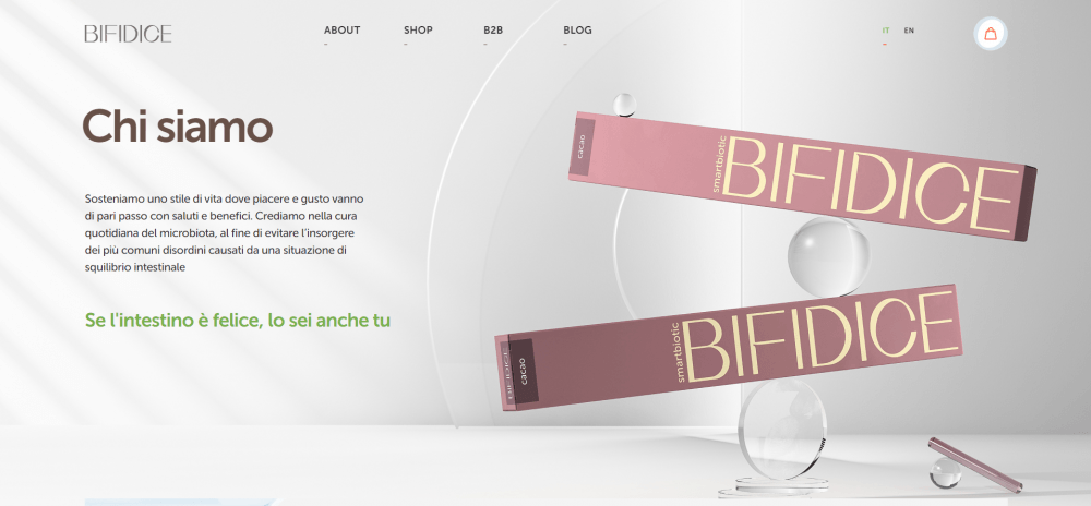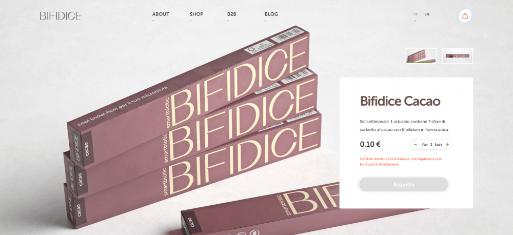 Основная языковая версия сайта разработана на итальянском языке, так как Италия — главная локация продаж Bifidice. Для клиентов из других стран добавлена англоязычная версия сайта.
