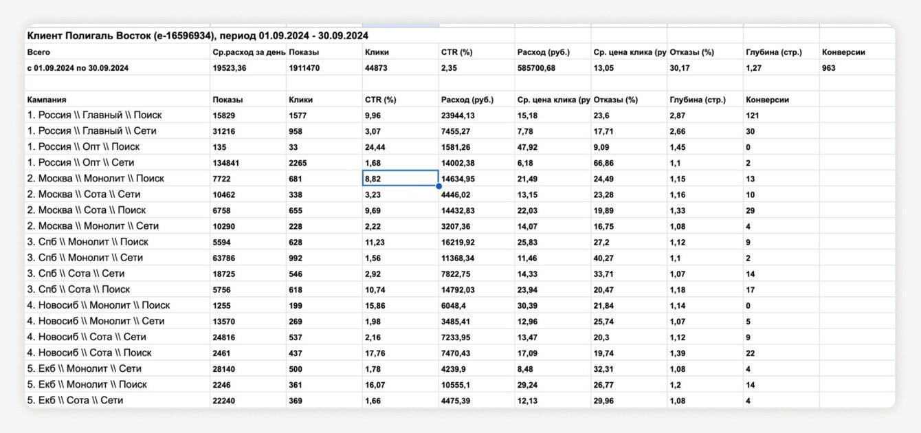 Товар сезонный, а значит, для каждого региона должны быть индивидуальные настройки рекламных кампаний, адаптированные под климат и сезонные колебания спроса. Бюджет для каждого региона тоже был разным, поэтому нам требовалась тщательная проработка стратегии.