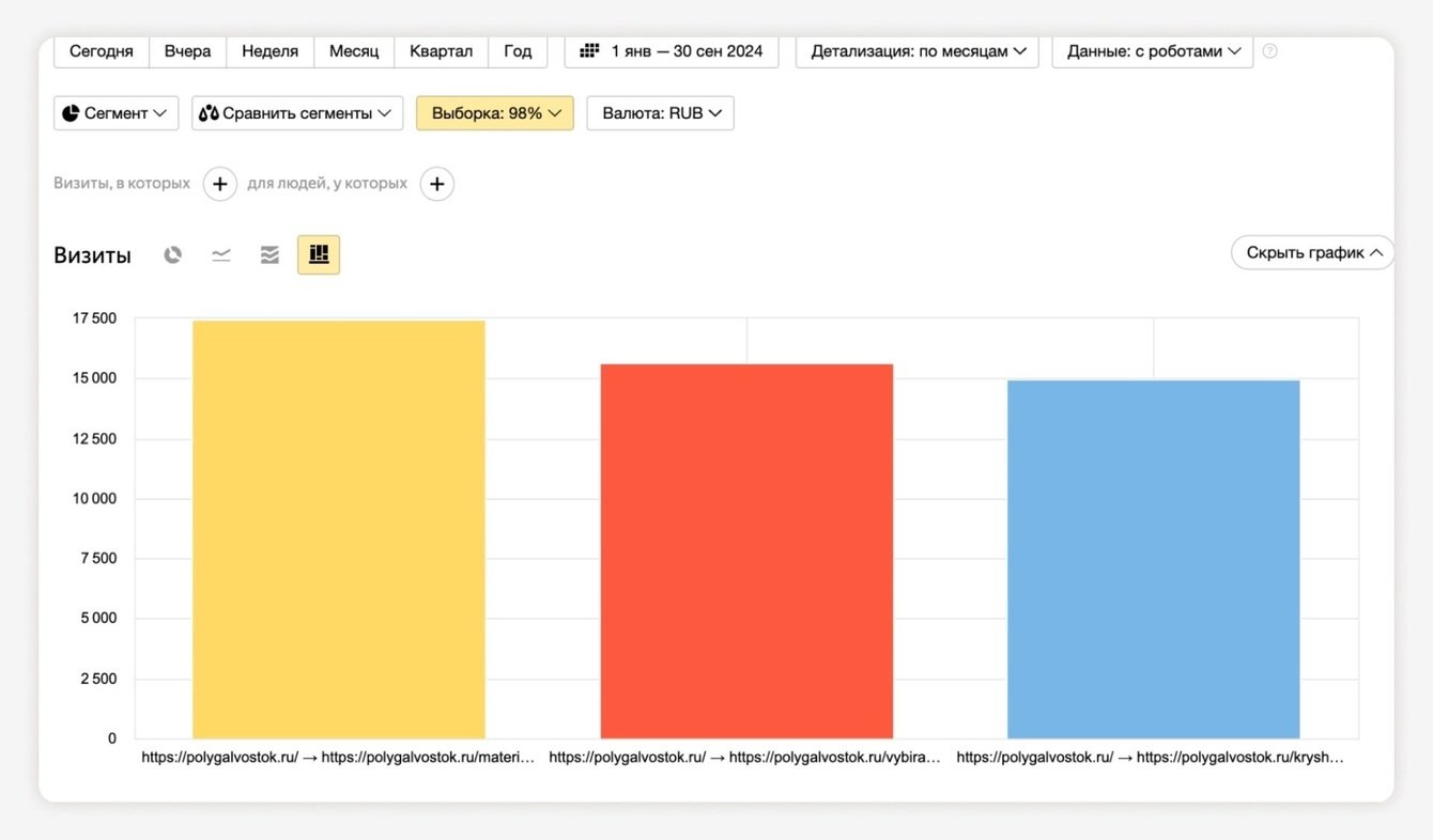 Пример трафика с января по сентябрь 2024 года на некоторых статьях в блоге (некоторые статьи набирают от 1500 посетителей в месяц).