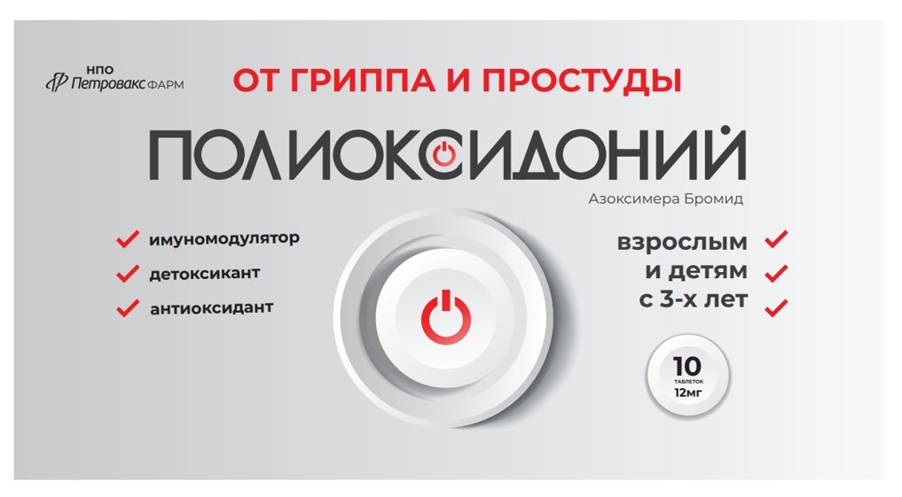 Полиоксидоний — препарат с комплексным механизмом действия для профилактики и лечения гриппа, ОРВИ на любом этапе заболевания с широким выбором форм выпуска для взрослых и детей с 1 года: таблетки, свечи и раствор. Ценовой сегмент: выше среднего (850-1100 рублей — таблетки и свечи, 1400 рублей — раствор). Конкуренты: арбидол, кагоцел, эргоферон и другие.