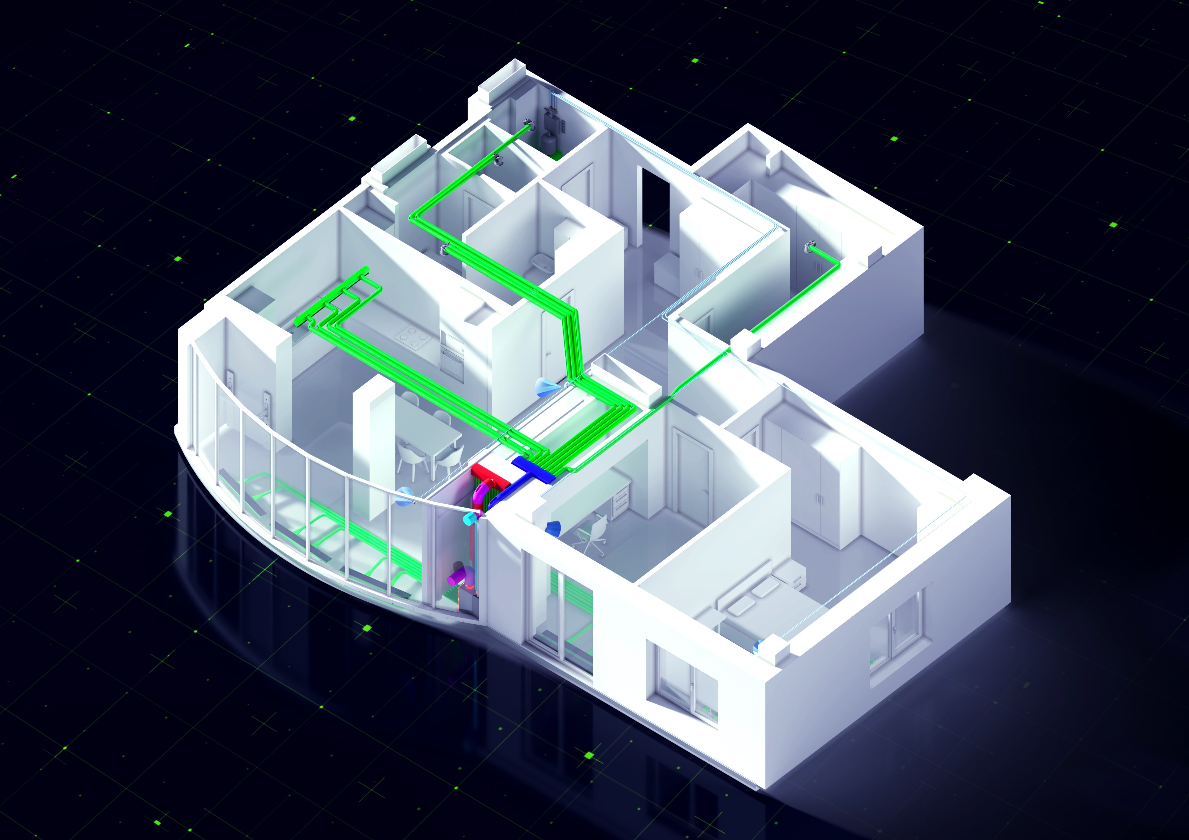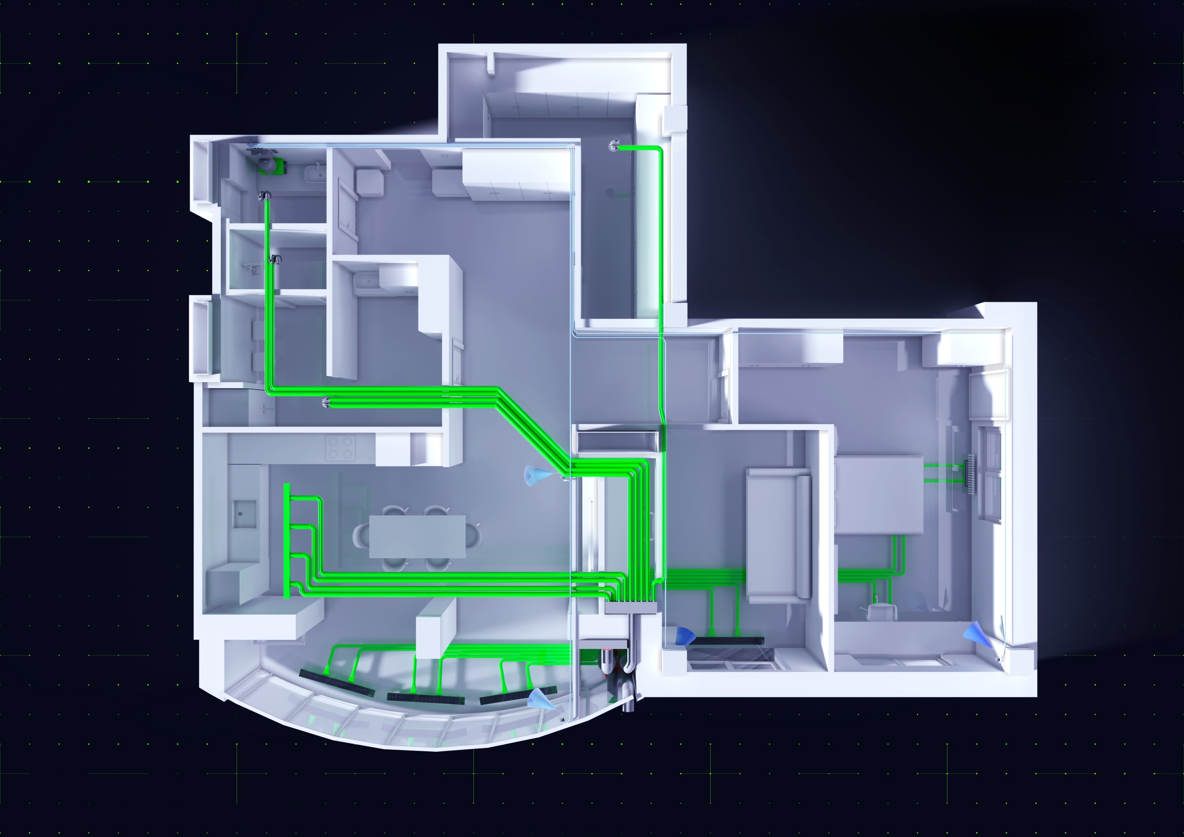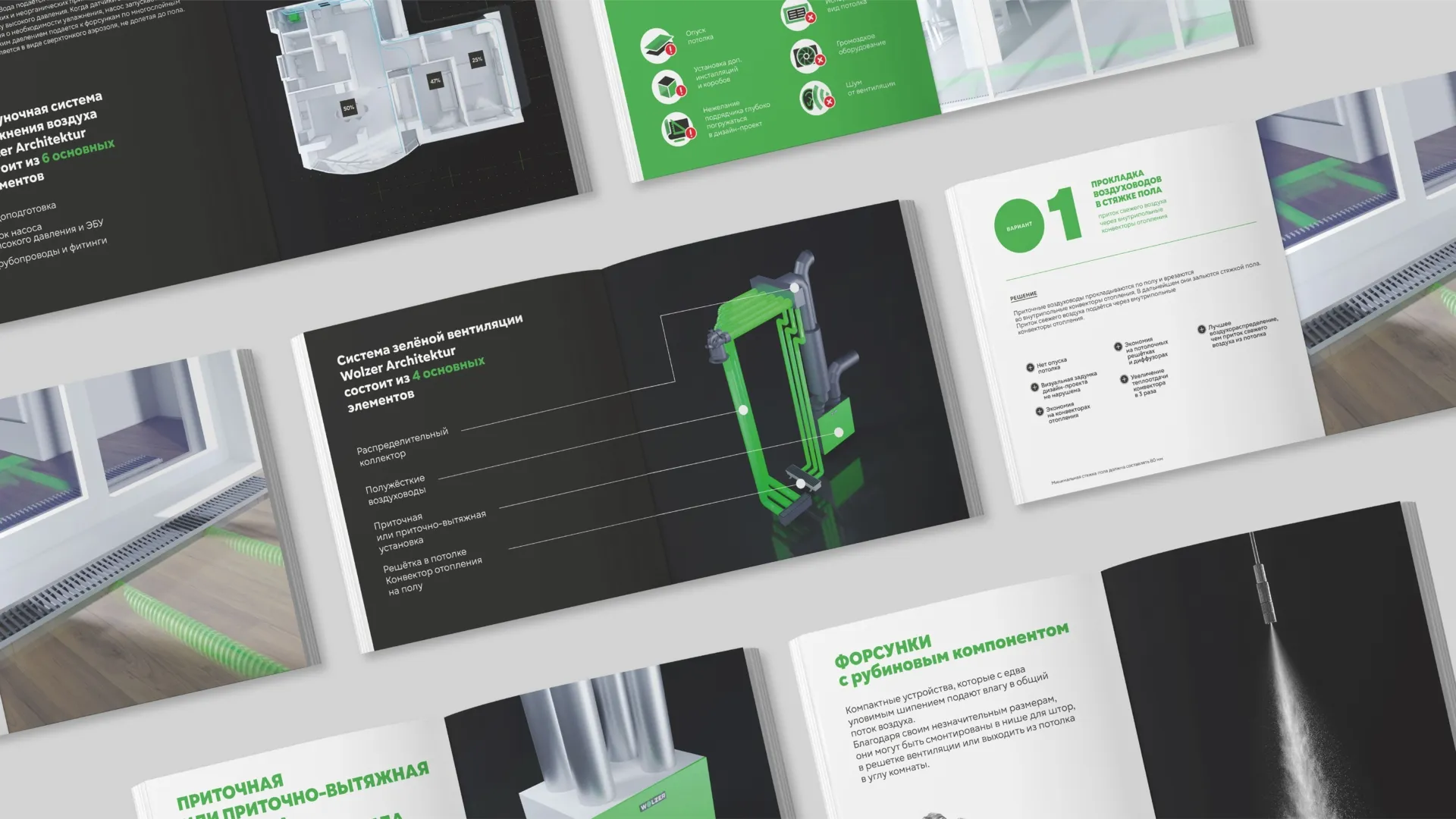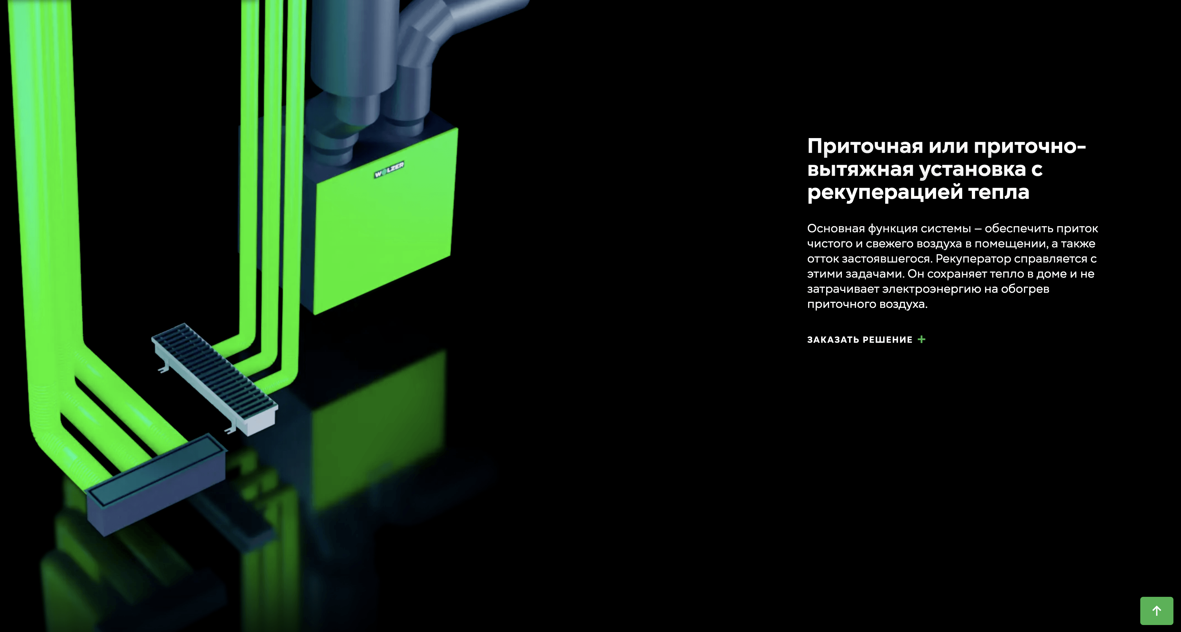 Основными изображениями является вымышленное пространство, напоминающее частный дом. Функционально монтаж зелёной вентиляции проводят на этапе стройки, но в будущем находится в вашем доме постоянно.