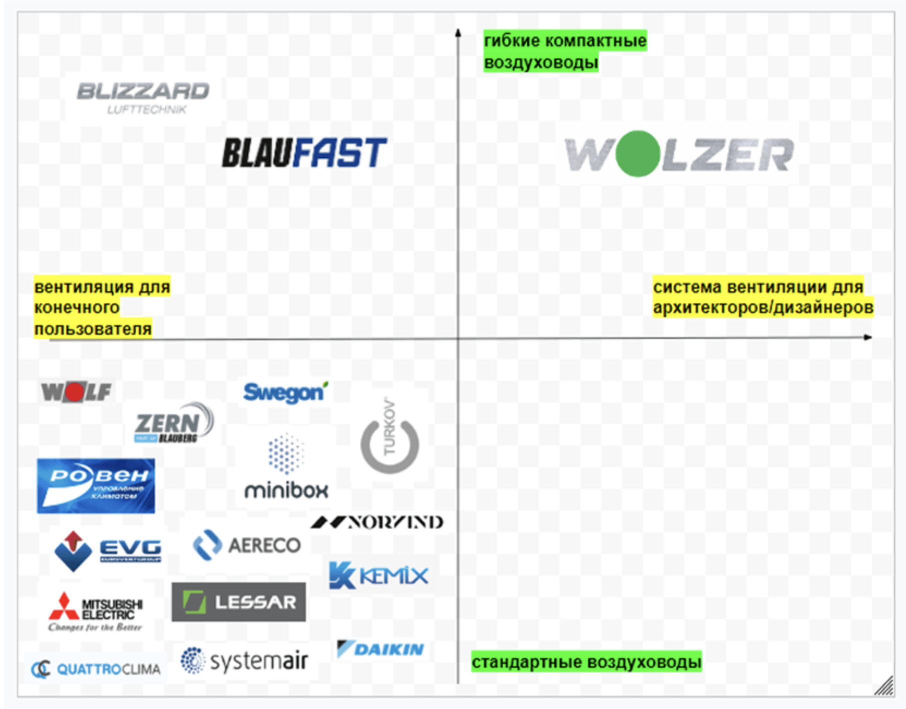 Конкурентный анализ показал, что само вентиляционное оборудование, несмотря на разнообразие производителей, стандартно и представляет собой по большому счету систему воздуховодов. Различия могут быть в материале (пластик или металл), размерах (высота профиля), цвете (крашеные или некрашеные), выборе того или иного вентиляционного оборудования (рекуператоры, диффузоры и пр.). В условиях современного рынка любое из этих преимуществ легко копируется, а значит, не может лечь в основу позиционирования.
